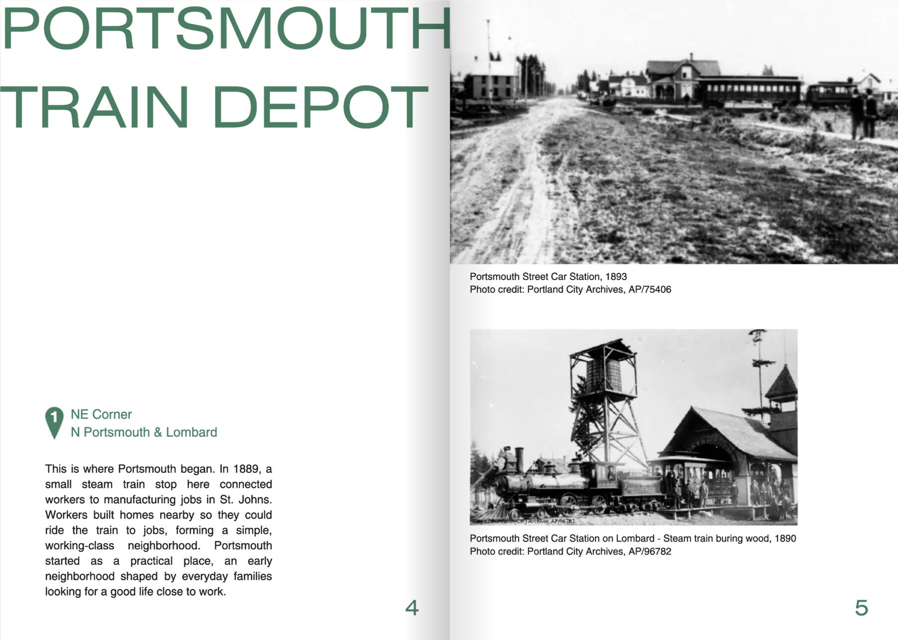 Role: research, designTasked with sharing the planning history and existing conditions materials for the Portsmouth neighborhood in Portland, OR in a way that is accessible and meaningful to the general public, I created a walking tour zine to bring the neighborhood to life through a sensory, walking experience. The zine takes participants on a tour of six meaningful locations, both historic and modern, to the development and story of the Portsmouth neighborhood. Using quotes, photos, historical narrative, and observation prompts, it invites readers to examine their experience of space as they move through their neighborhood, and consider the role that story plays in the development of our environment.